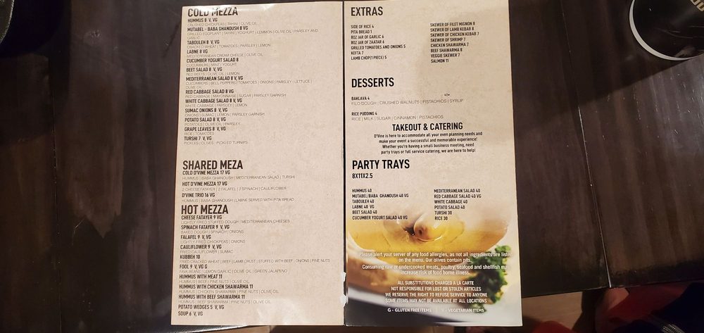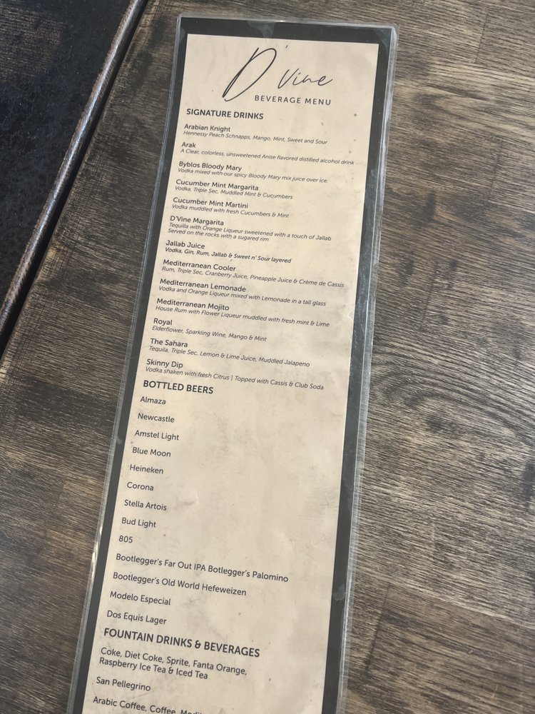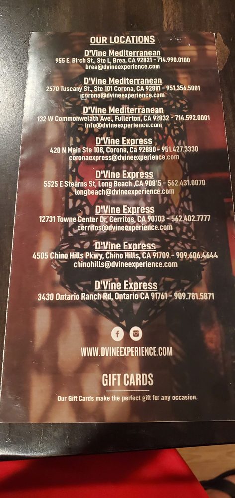 Dvine Mediterranean Experience - Brea offers a wide range of Mediterranean options with generous portions and friendly service. The restaurant is wheelchair accessible and has outdoor seating, making it a versatile choice for various occasions. Highlights include the Chicken Shawarma and juicy beef kabobs, along with flavorful dishes like the cheese fatayer and shrimp kebob. The staff is attentive and accommodating, ensuring a pleasant dining experience. With a full bar, happy hour specials, and a variety of vegan and vegetarian options, Dvine Mediterranean Experience - Brea caters to a diverse range of customers. The consistent quality of the food, easy online ordering, and ample parking make it a go-to spot for delicious Mediterranean cuisine in Brea.